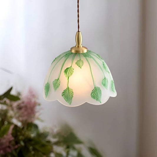 Art Nouveau Frosted Glass Pendant Light With Green Leaf Pattern