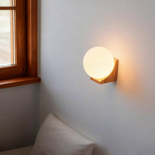 Minimalistische Wandlampe aus Holz mit Kugelschirm