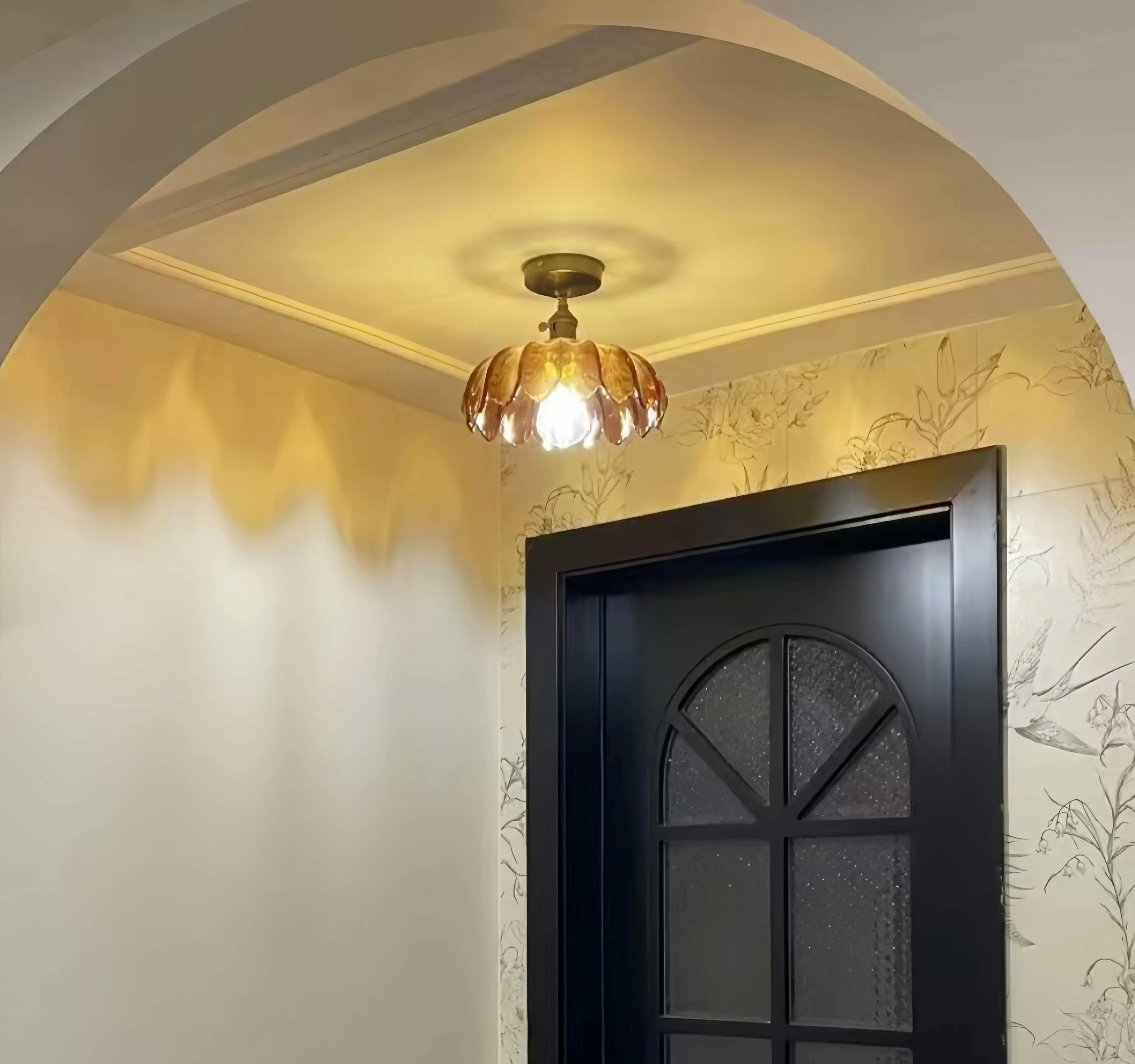 Diese Deckenleuchte messing antik besticht durch ihr Vintage-inspiriertes Design mit einem lotusblütenförmigen Glasschirm. Der Schirm dieser vintage Deckenleuchte ist aus transluzentem Wellenglas gefertigt, was ihm eine interessante Textur verleiht. Die Deckenleuchte blume ruht auf einem Messingsockel, der ihr eine klassische und luxuriöse Note verleiht. Die freiliegende Glühbirne in der Mitte unterstreicht die Retro-Ästhetik und sorgt für ein warmes, einladendes Licht.