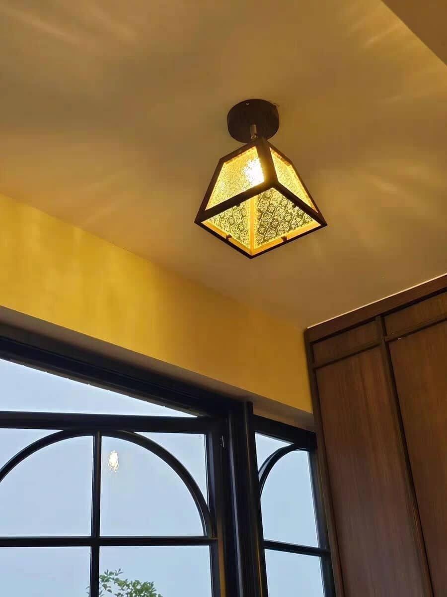 Sublimez votre intérieur grâce à l'éclat enchanteur de ce plafonnier vitrail unique. Doté d'une silhouette trapézoïdale, ce plafonnier rustique bois rustique met en valeur des panneaux de verre vert et ambré finement gaufrés. Son cadre en bois riche rehausse son charme rustique, tandis que ses ferrures en laiton ajoutent une touche de raffinement. Idéal pour les couloirs et les entrées, ce plafonnier industriel allie design intemporel et beauté artisanale, créant une ambiance chaleureuse à chaque allumage.
